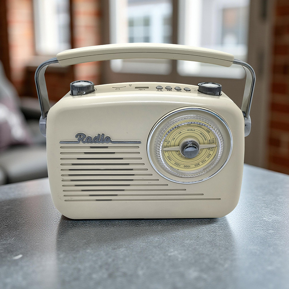 Το Retro ραδιόφωνο σε κρεμ χρώμα είναι ένα φορητό ραδιόφωνο/ηχείο που συνδυάζει vintage αισθητική με σύγχρονη τεχνολογία.