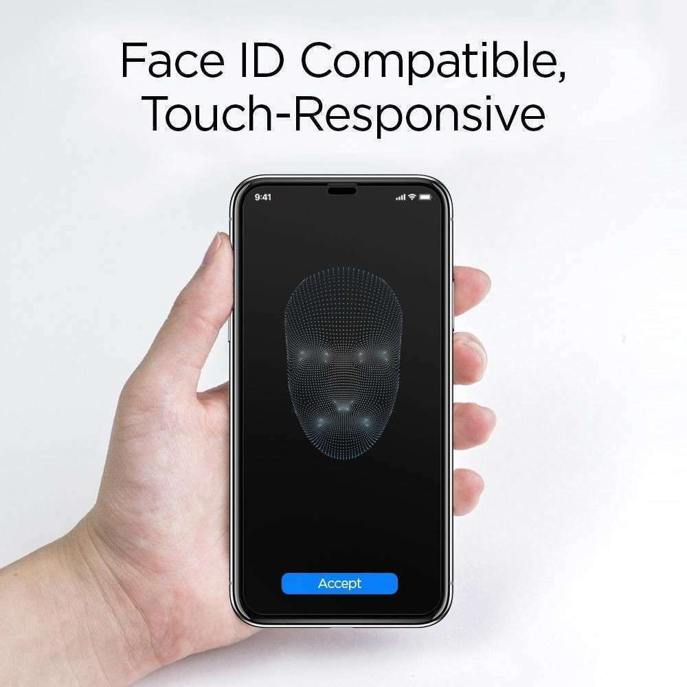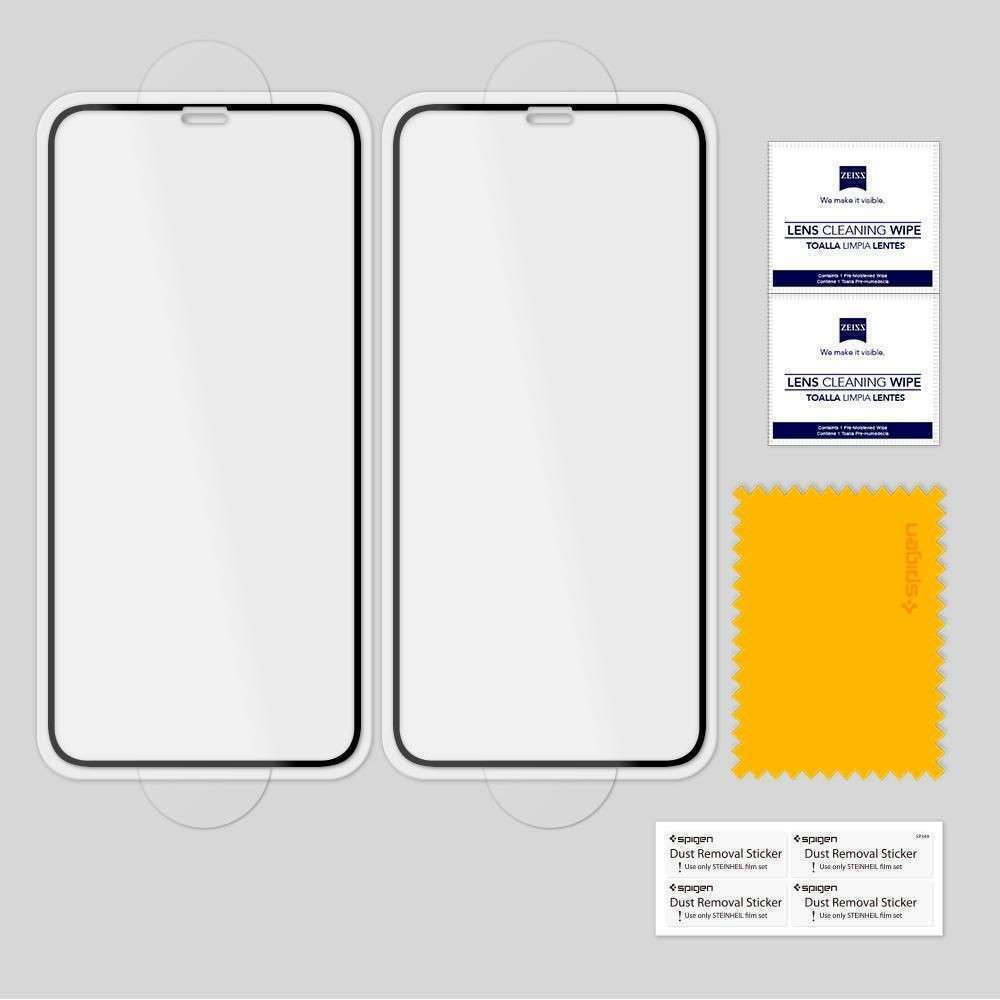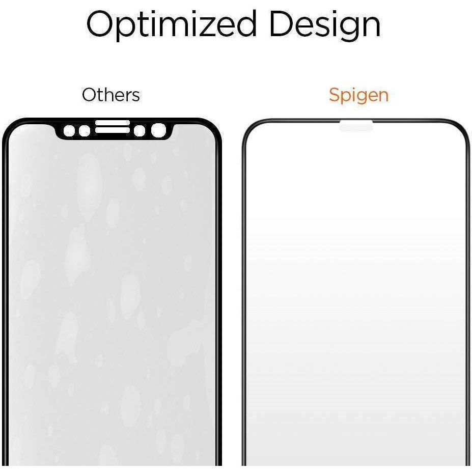 Τζάμι προστασίας πλήρους οθόνης Spigen 2 τεμαχίων με μαύρο περίγραμμα, το οποίο μέσα από ειδική θερμική επεξεργασία αποκτά υψηλό βαθμό σκληρότητας (9Η).