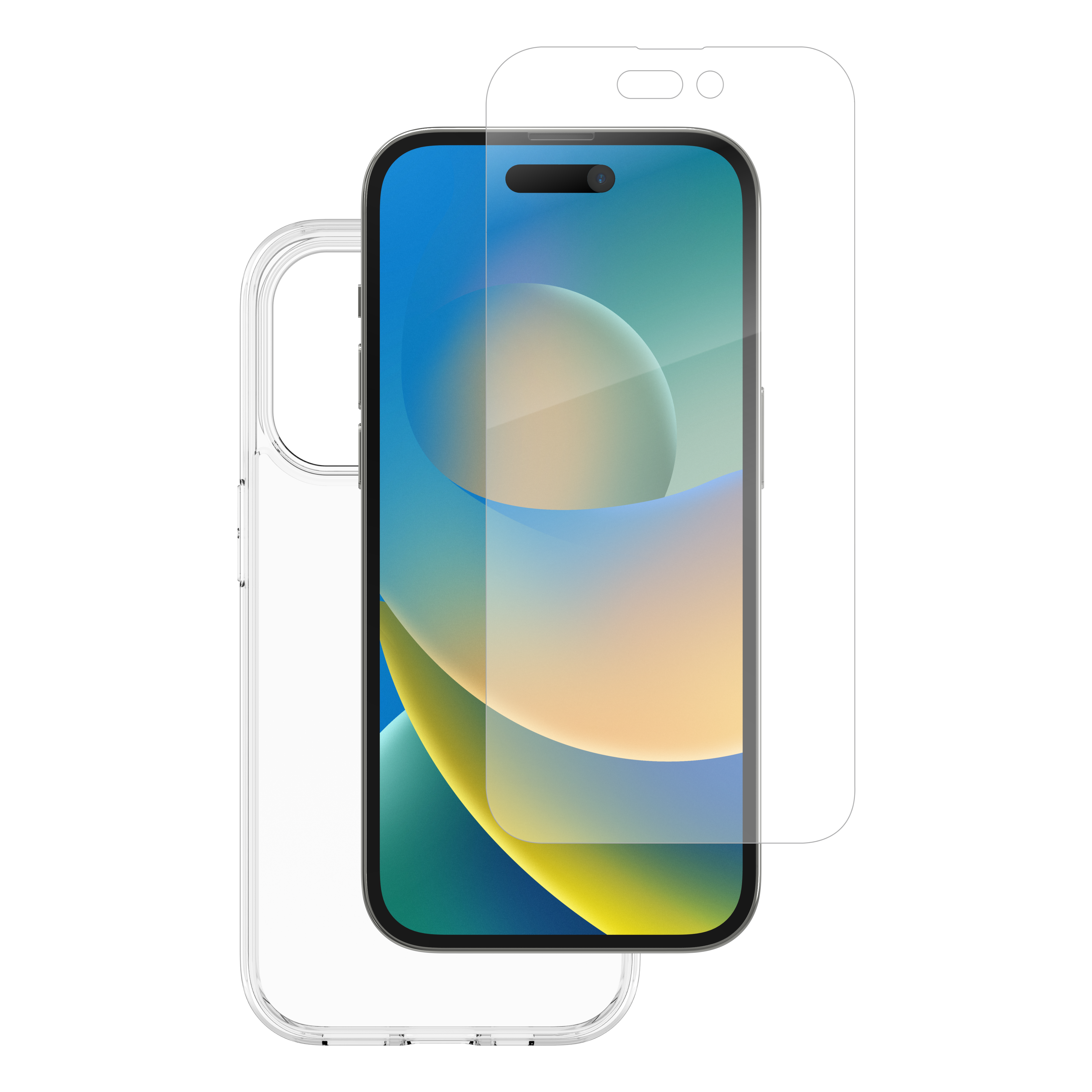 Διάφανη προστασία απέναντι στις πτώσεις και τις γρατσουνιές για σένα που θέλεις την καλύτερη ασπίδα από άκρη σε άκρη: Tempered Glass Elite™ για το iPhone 14 Pro και διάφανη θήκη bumper από πολυκαρβονικό